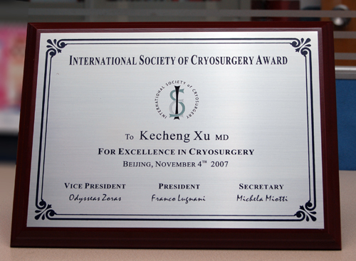 在2007年11月5日晚,北京国宾酒店,第14届国际冷冻学术大会欢迎晚会上,国际冷冻学会主席Franco博士向全世界数十名著名冷冻治疗专家颁发了“世界冷冻治疗特别贡献奖”。我院徐克成院长、牛立志副院长双双获此殊荣。