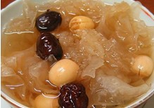 百合银耳羹。取百合50克,银耳25克,冰糖25克。百合、银耳用温水浸泡1小时,洗净入锅,加水适量,慢火煮至汤汁粘稠,加入冰糖即成。