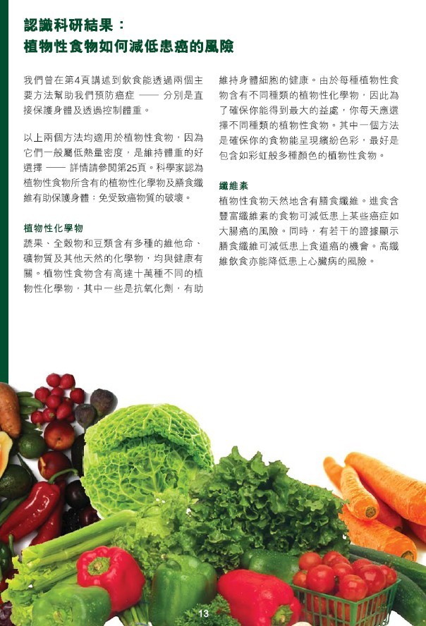 植物性食物含有的植物性化学物及膳食纤维有助保护身体,免受致癌物质的破坏。蔬果、全壳物和豆类含有多种的维他命、矿物质及其他天然的化学物,均与健康有关。植物性食物含有高达十万种不同的植物性化学物,其中一些是抗氧化剂,有助维持身体细胞的健康。