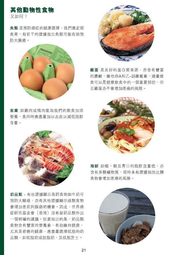 鱼类是预防癌症的健康选择,我们应定期食用,有若干的证据指出鱼类有助预防大肠癌;鸡蛋是良好的蛋白质来源,也含有丰富的维他命A和乙-胡萝卜素,适量进食可以是健康饮食中的一个重要部分,而且鸡蛋也是不会增加患癌的风险。