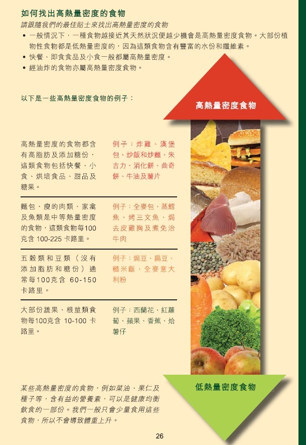 较低热量密度的食物含有较少脂肪或糖份,并含有丰富的纤维素和水分,有助延长饱肚的时间。更重要的是某些较低热量密度的食物如蔬菜及其他含丰富纤维素的食物,可更直接预防某些癌症。