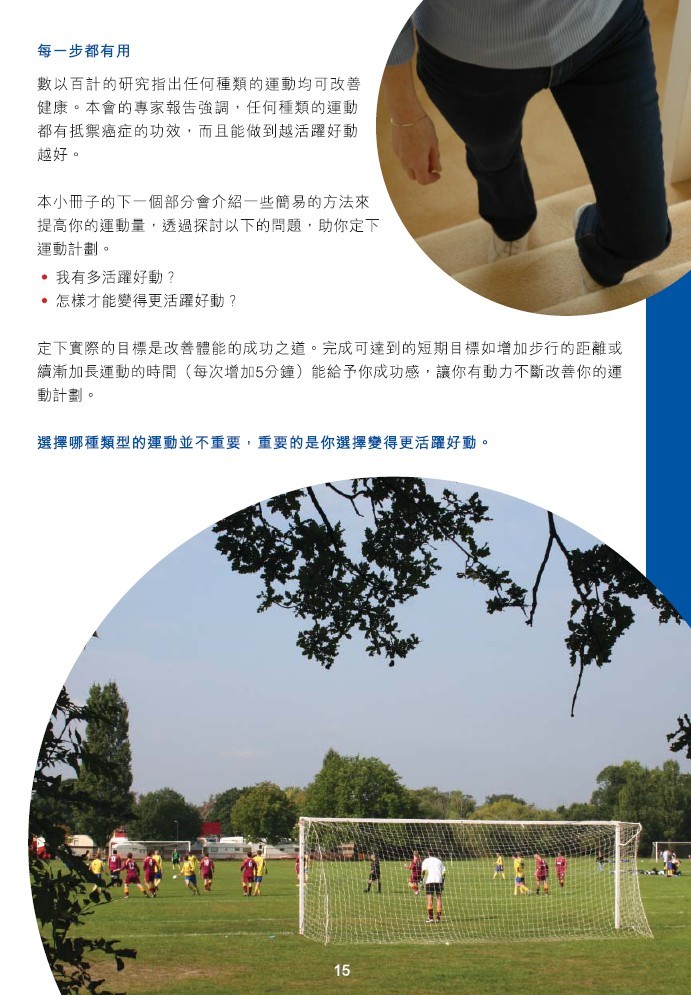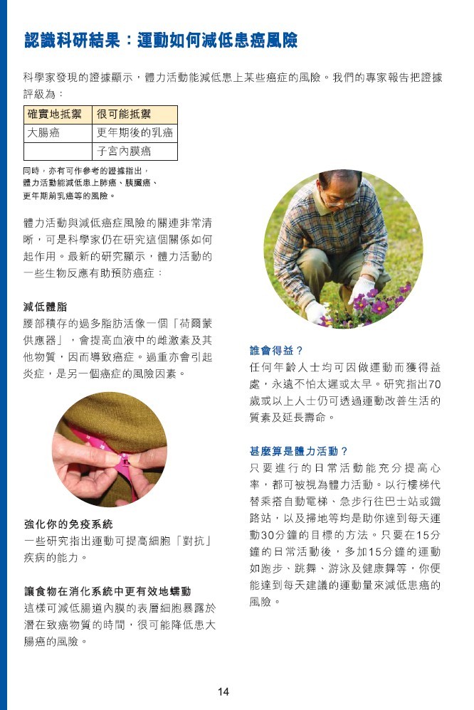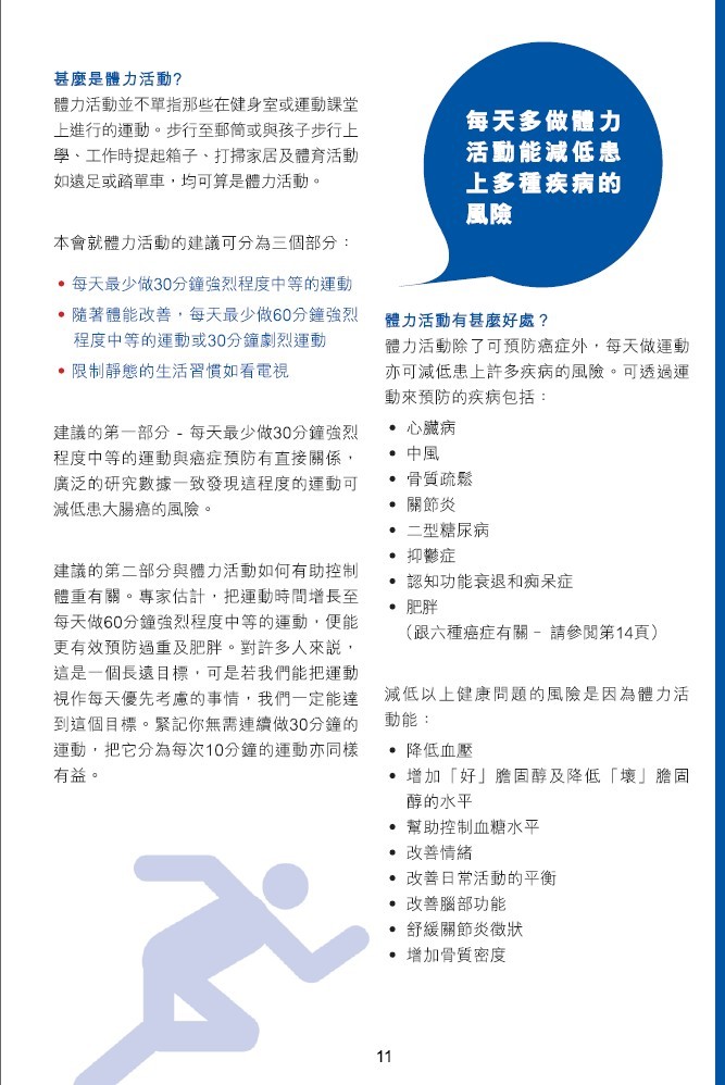 体力活动并不单指那些在健身室或运动课堂上进行的活动。步行至邮筒或与孩子步行上学、工作时提起箱子、打扫家具及体育活动如远足或踏单车,均可算是体力活动。......
