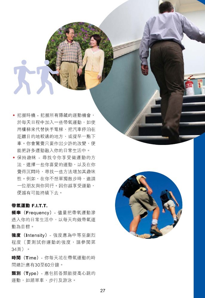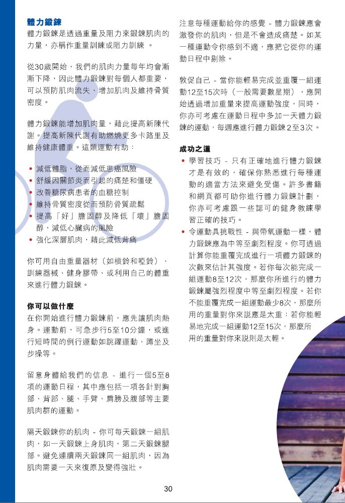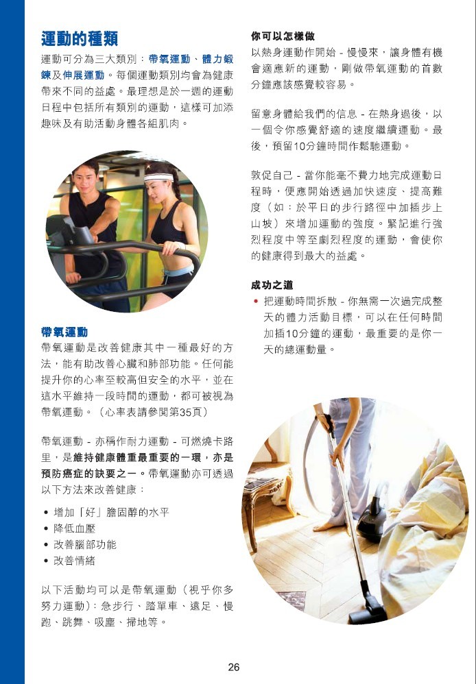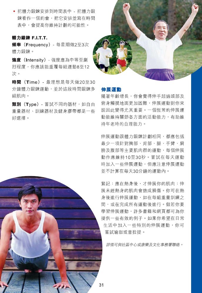 运动可分为三大类别:带氧运动、体力锻炼及伸展运动。每个运动类别均会为健康带来不同的益处。最理想是于一周的运动日程中包括所有类别的运动,这样可加添趣味及有助活动身体各组肌肉。
