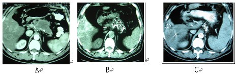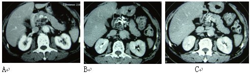 图1 男性,80岁。胰腺沟突部腺癌。A:治疗前,B:冷冻加碘粒子植入后3个月复查,C:治疗后12个月复查。