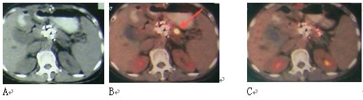 图3 女性,59岁。胰腺头部4X4 cm病变,活检显示未分化腺癌。A:治疗前;B:冷冻-碘粒子治疗后12个月复查PET-CT,原先病变无明显活性,但在胰腺体部出现新病变,给予冷冻治疗;C:3个月后复查PET-CT,病变活性抑制。患者生存28个月。
