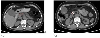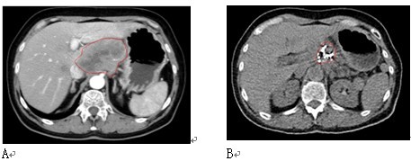 图4 女性,61岁。胰腺颈部3X3cm病变,活检显示腺癌。肝内有3个转移灶(图中未显示)。A:治疗前;B:冷冻加125碘粒子植入治疗,7个月后复查,胰腺和肝内无明显癌肿证据(肝内病变未显示)。患者迄今已生存4年。