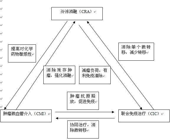 将冷冻消融(CRA)(加125碘粒子植入)-肿瘤微血管介入(CMI)和联合肿瘤免疫疗法(CIC)相结合,以发挥相辅相成作用,看来应作为治疗进展性肿瘤,让患者长期生存的重要策略(图7)。化疗和放疗仅用于没有接受过此类治疗,预期癌细胞对其较敏感者。我们将这一系列的治疗成功地组合起来,按照患者情况个体化选择应用(personalization,P),形成所谓“3C+P”治疗模式” (3C therapy model)。