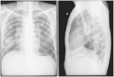 曾先生的X线胸片:两肺布满斑块状不均质阴影,提示肺炎症和纤维化