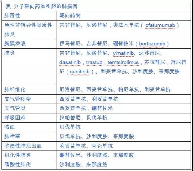靶向药物也可引起肺损害(见表)。在84家机构、1976例接受吉非替尼治疗的非小细胞性肺癌患者中,有70例(3.5%)发生间质性肺炎, 31例(1.6%)死亡,所有患者均有胸部放疗史。男性、吸烟史和既往合并间质性肺炎者较易发生。有人统计日本以外地区接受吉非替尼治疗的92821例患者,间质性肺病变的总发生率约为0.28%;而在日本地区接受吉非替尼治疗的65527例患者中,发生率约为1.7%。