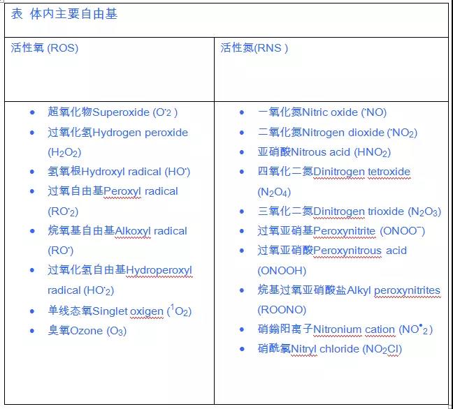 人体细胞的生命大分子,如果失去一个或一个以上电子,其所含电子不再成双配对,成为游离的分子、离子、原子或原子团,即自由基。主要的自由基包括活性氧(ROS)和活性氮(RNS)(见下表)。