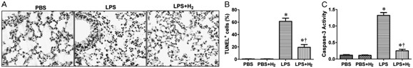 该图显示LPS灌注的小鼠肺泡上皮凋亡严重(LPS),而在吸氢的实验性肺损伤小鼠肺上皮凋亡明显减轻(LPS+H2)。A是肺组织学改变,B显示凋亡指数,可见LPS组最高,加上吸氢后,指数下降。PBS 系对照组