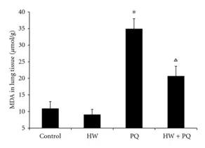 该实验又测定肺丙二醛(MDA)。丙二醛是膜脂过氧化重要的产物之一,测定MDA可了解自由基过氧化程度。与对照组和HW组相比,PQ组和PQ + HW组的肺MDA水平增加,然而,PQ + HW组MDA显著低于PQ 组,说明氢气可减少过氧化,起抗氧化作用(下图)。