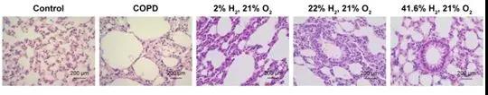 第三份实验检测了吸氢对吸烟引起的慢性阻塞性肺病(COPD)鼠模型的作用。24只小鼠随机分成5组:对照组、COPD组、低氢组、中氢组和高氢组。除对照组,其他各组均吸烟4个月,形成类COPD模型。吸氢的鼠分成低、中、高氢三组,吸入的氢浓度分别为2%、22%和41.6%,每天吸氢2小时,4个月,系与吸烟同时进行。