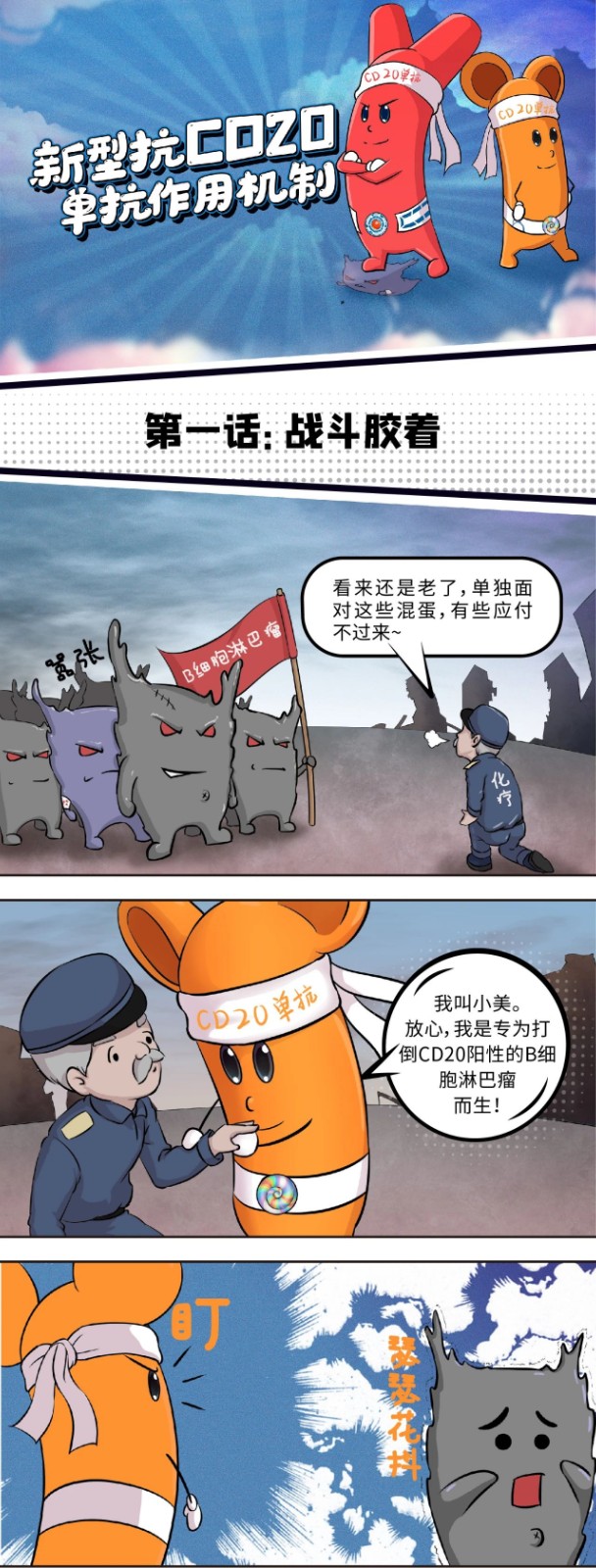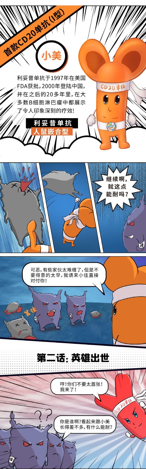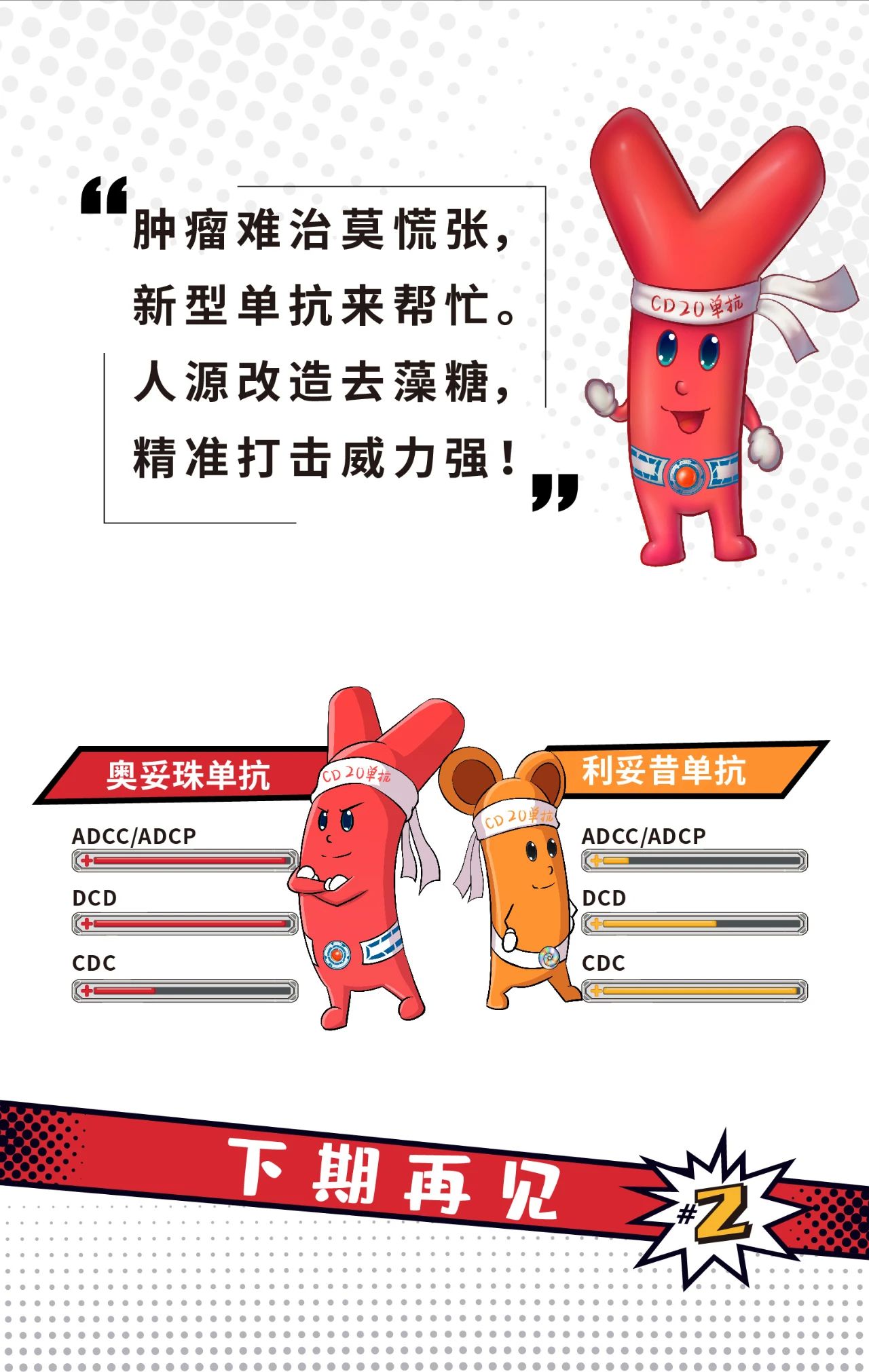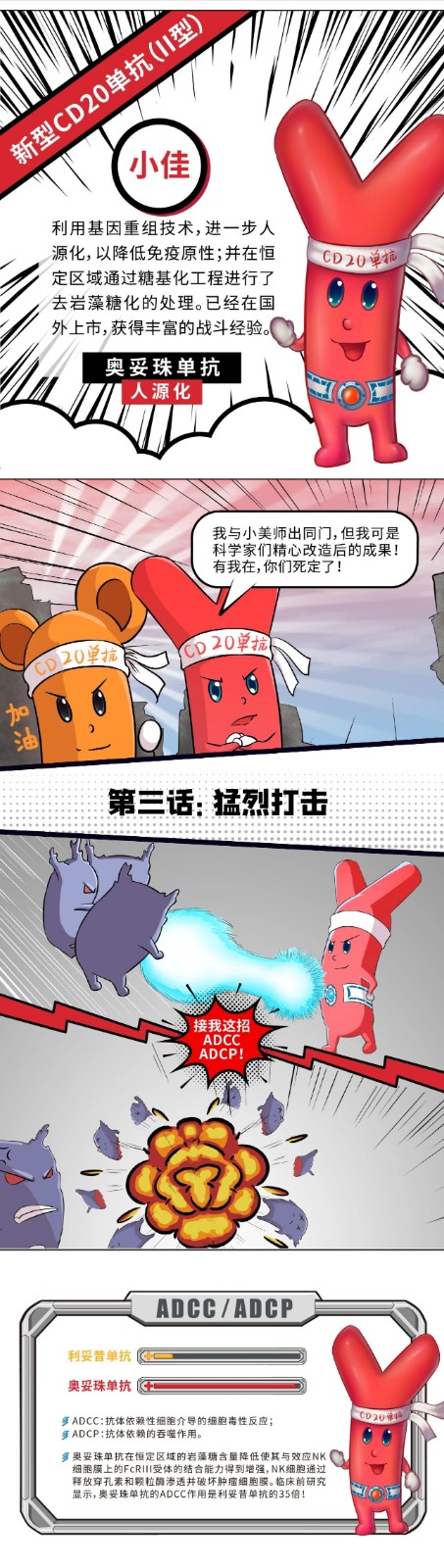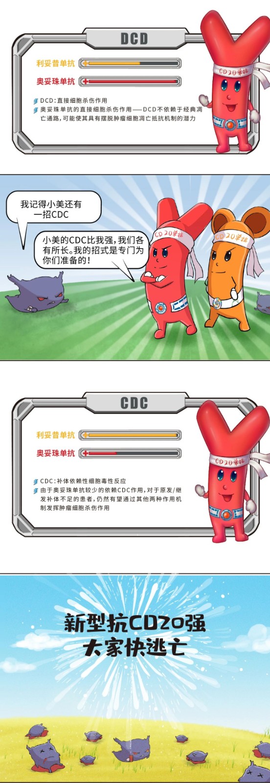 在B细胞淋巴瘤的治疗方案中,2000年在中国上市的I型抗CD20单抗——利妥昔单抗无疑具有划时代的意义,因为它的应用为中国B细胞淋巴瘤患者带来了更长的生存。时隔20年,新型(II型)抗CD20单抗——奥妥珠单抗即将登陆中国,TA究竟有什么特点?和利妥昔单抗有什么不同呢?让我们通过一组漫画先睹为快吧!