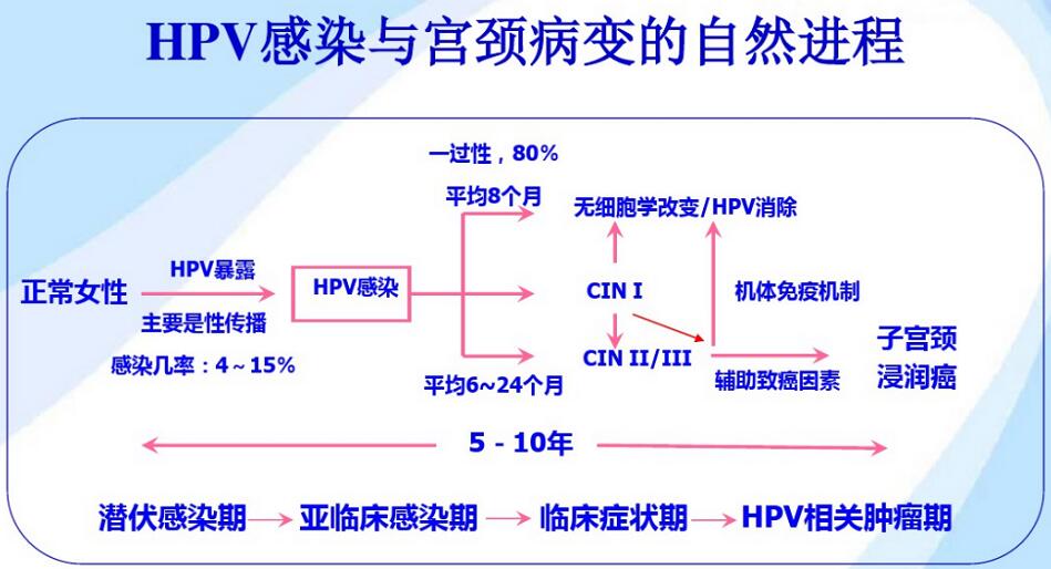 从HPV感染到得宫颈癌,是一个漫长的过程,需要5-10年。HPV的感染机率仅为4%-15%,其中80%平均8个月就被清除了。未被清除的HPV持续感染,形成了细胞的不典型增生,从轻度到中度再到重度。再在其他因素的作用下,变成癌症。这启示我们,早发现,早处理,就能早日远离HPV带来的疾病。(如下图)