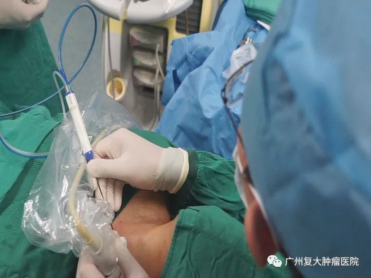 “患者的甲状腺肿越长越大,逐渐出现气管压迫、呼吸和吞咽困难的症状。她自身不想接受开刀手术,这种情况微波消融是一个很好的选择。”牛立志院长说道,由于患者甲状腺肿巨大,且双侧多发结节,在消融过程中需要足够的耐心,同时要分区域一步步进行消融。“整个过程就一个针眼。”