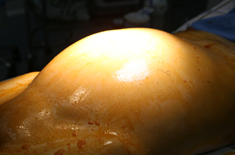 9月7日9:00,手术室无影灯下,随着一层层皮肤被划开,小陈腹腔的“罪魁祸首”暴露无疑,硕大的肿瘤外有一层完整的包膜,随着心跳上下晃动。主刀医生王教授眼神坚毅,柳叶刀快而准,避免了任何一丝差错,将肿瘤完整地剥离出来且没有弄破包膜。