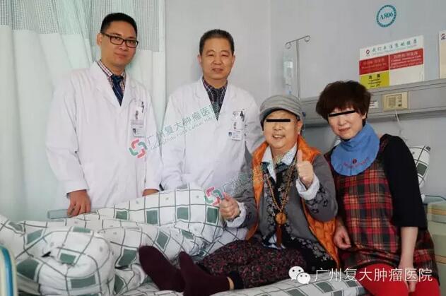 2016年1月18日上午10时,在广州复大肿瘤医院南院八楼病房出现感人的一幕:两周前刚做了脑瘤切除术的74岁退休女教师,端坐在床上,面对着主刀医生程江鹏教授、林宇国医师,她竖起两个大拇指一字一句地说:“医院好!医生好!没有你们我就完蛋了,你们是我的再生父母!”随后,她又兴奋地一次次高高举起右手,“你们看,我能举得好高啊!”