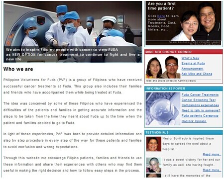 这天的聚会主要是演示菲律宾志愿者网站。Nestor讲话后,会议室大屏幕上就显示出网站的内容。网站名为“Philippine Volunteers for Fuda,PVF”,制作者是一对美籍菲律宾夫妇,丈夫名叫Mike,妻子名叫Chonatrivinio,妻子患右肾尤文氏肉瘤伴肺转移,2009年来复大住院,接受了血管介入、冷冻和碘粒子植入,以及联合免疫治疗,转移灶消除。出院后夫妇就开始制作这个网站,其内容包括Nestor等病人的治疗经过、住院感受、癌症特殊治疗等。