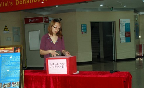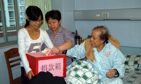 在我院接受术后检查的彭细妹踊跃带头捐款,并且为玉树灾区的人民打气。