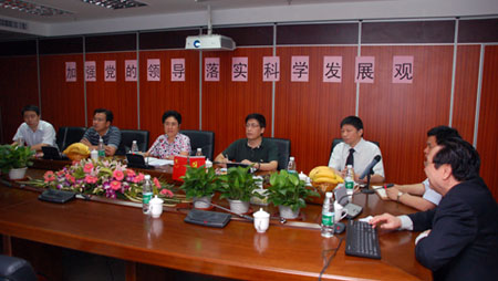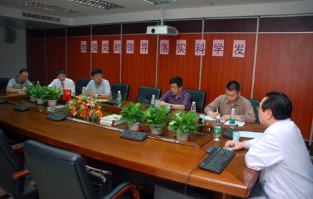 党委办主任吴子刚(左四)等领导听取徐克成总院长的汇报
