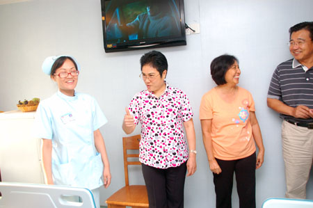 省卫生厅纪检组长亓玉台(左二)一行到病区看望住院病人彭细妹(右一)