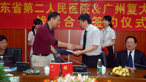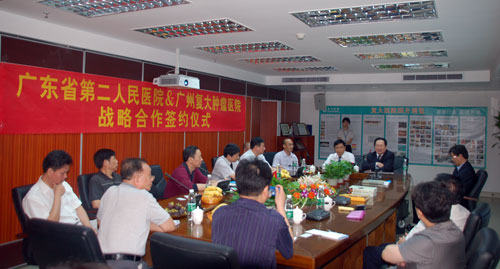 2010年6月4日上午,广东省第二人民医院&广州复大肿瘤医院战略合作签约仪式在复大医院会议室举行。参加签约仪式的省二院领导代表有田军章院长等一行,复大医院总院长徐克成、总经理左建生、执行总院长牛立志等,副总经理刘建国为大会主持。