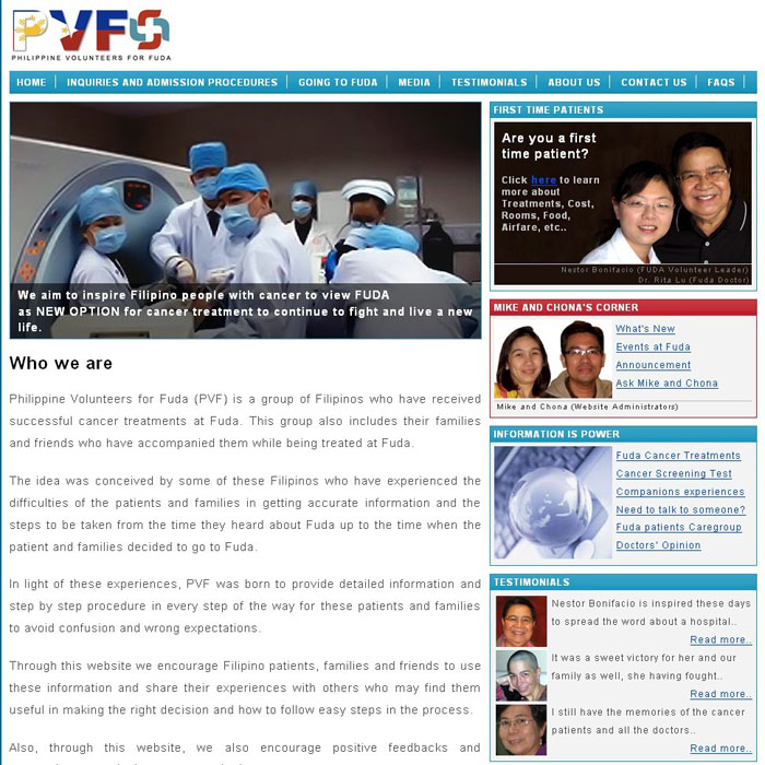 这天的聚会主要是演示菲律宾志愿者网站。Nestor讲话后,会议室大屏幕上就显示出网站的内容。网站名为“Philippine Volunteers for Fuda,PVF”,制造者是一对美籍菲律宾夫妇,丈夫名叫Mike Dionisio,妻子名叫Chonatrivinio DionisioCCC,妻子患右肾尤文氏肉瘤伴肺转移,去年来我院住院,出院后夫妇就开始制作这个网站,其内容包括Nestor等病人的治疗经过、住院感受、癌症特殊治疗等。