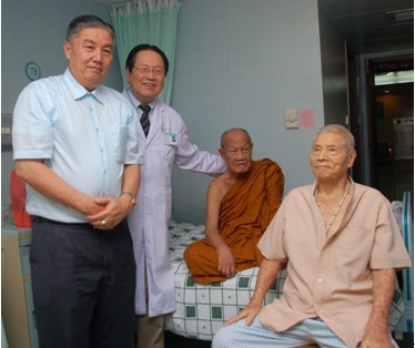 泰国老人(右1)、正在接受治疗的大和尚(右2)和老人的儿子(左1)