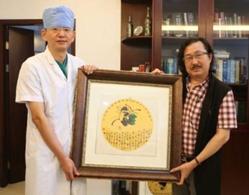 当天赠画小仪式上是在徐克成办公室进行的,牛立志院长还穿着手术服,刚从治疗室出来。画家陈训勇对两位院领导激动地说,“感谢这一月来,你们带领医学团队,为我太太进行精心的治疗和调理。你们多次亲临病房关心我太太病情,让我和我太太感到温暖同时也增强她抗击病魔的信心!我特意在画上写了十六个字,“上善若医,大医精诚,厚德载医,载笑载言。”