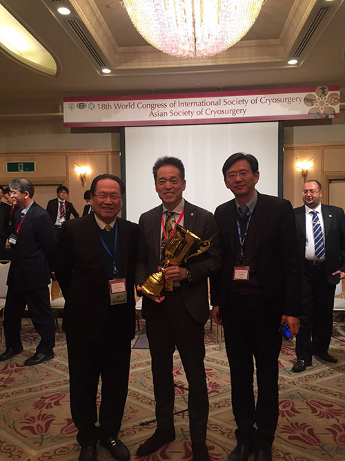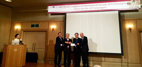 徐克成教授代表17屆理亊会向在肿瘤冷冻治疗领域取得优异成绩者颁发了奖杯和奖金。其中,日本金沢大学Tsuchiya教授获金奖,中国中山大学李家平教授获银奖,以色列Yaron医生获铜奖。