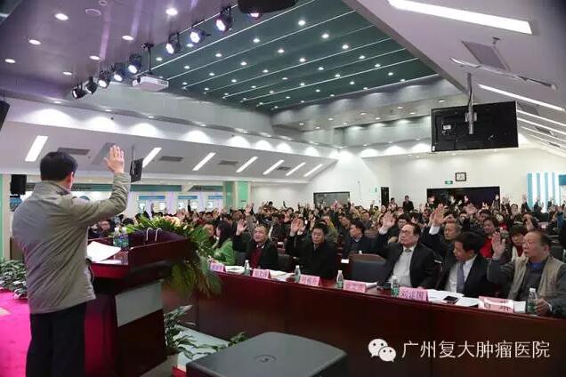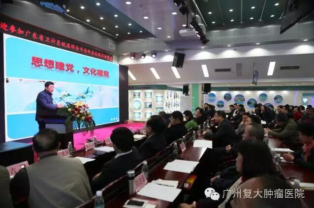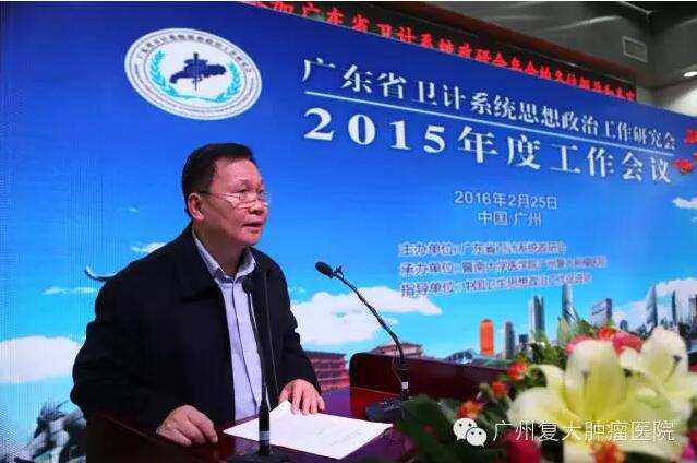 2016年2月25日下午,“广东省卫计系统思想政治工作研究会2015年度工作会议”在广州复大肿瘤医院隆重召开,会议由广东省卫计系统政研会主办,广州复大肿瘤医院承办。广东省卫计委主任、省卫计系统政研会会长陈元胜,省卫计委副主任、党组成员刘银燕,省卫计委直属机关党委专职副书记、党委办主任廖俐珍,省卫计系统政研会常务副会长亓玉台,省卫计系统政研会副会长兼秘书长吉琳,省卫计系统政研会专职副会长宋吉敏等领导,“时代楷模”、广州复大肿瘤医院总院长徐克成,以及200多名来自广东省卫计单位及各大医疗机构的代表出席了会议。