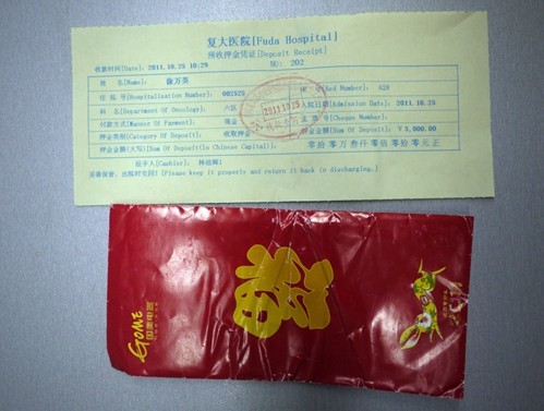 入院后,三千元红包很快当做住院预收押金缴费,徐克成院长当天就将收据送到漏建国手中。作为“礼尚往来”,复大收了漏建国一盒茶和一袋竹笋,送了鲜花和一些慰问品给他们。