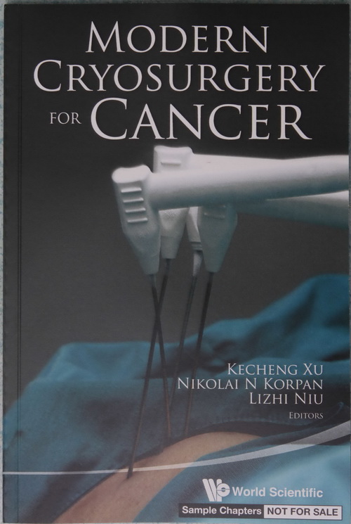 2012年7月,由徐克成、Korpan 和牛立志主编的英文版《Modern Cryosurgery for Cancer》由World Scientific Publication Co. 出版在全世界发行。这是迄今全世界第一本冷冻治疗癌症专著,全书980页,主要汇集了世界最新有关冷冻治疗的基础和临床研究成果,反映了复大肿瘤医院10年来冷冻治疗肝癌、肺癌、胰腺癌等数十种癌症的经验。美国、日本、法国和瑞典等国外学者,以及我国上海、北京等地著名冷冻治疗专家参加了编写。本书已被国际冷冻治疗学会推荐为冷冻治疗技术的主要参考用书。