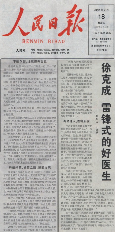 2012年7月18日,中国共产党中央委员会的机关报《人民日报》,以“徐克成 雷锋式的好院长”为标题报道了我院。