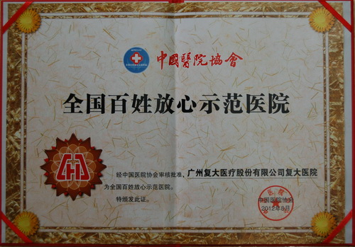 2012年8月,中国医院协会公布了新一批全国百姓放心示范医院名单,复大医院榜上有名。这是我院继获得“全国诚信民营医院”后,今年获得的又一个国家级荣誉称号。同时,我院左建生总裁荣获“全国百姓放心示范医院优秀管理者”称号。