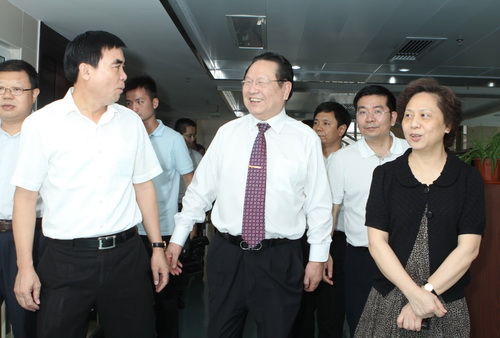 总院长徐克成带领广州市纪委严翠芳副书记(右一)、天河区委书记区人大常委会主任石奇珠(左一)参观复大天河医院