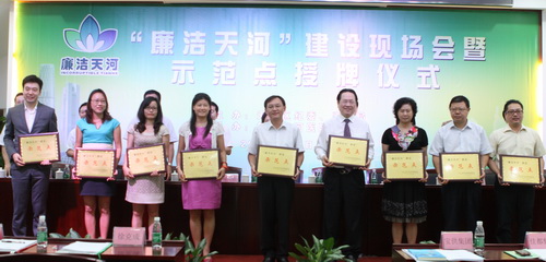 为推进“廉洁天河”建设向纵深发展,天河区纪委监察局近日分别在机关、街道、企业、商会(行业协会)中择优确定10个单位,作为“廉洁天河建设示范点”。2012年9月3日,天河区在示范点之一的复大天河医院召开“廉洁天河”建设现场会暨示范点授牌仪式。广州市纪委副书记严翠芳,天河区委书记、区人大常委会主任石奇珠等市纪委和区班子领导出席会议。会前,与会领导和参会代表参观了复大天河医院。