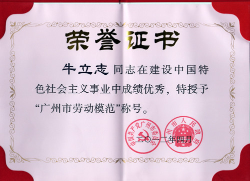 2012年4月28日,2009-2011年度广州市劳动模范和先进集体表彰大会在广州举行。此大会旨在鼓励及表彰自09年以来广州各战线、各行业涌现的模范人物,树立典型,进一步推进广州市的精神文明建设。经市委、市政府决定,授予230名同志“广州市劳动模范”称号。其中,我院牛立志执行院长位居其一,并获得大会颁发的荣誉证书及金质奖章。