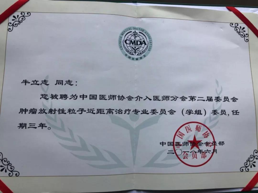牛立志被聘为中国医师协会介入医师分会第二届委员会肿瘤放射性粒子近距离治疗专业委员会(学组)委员