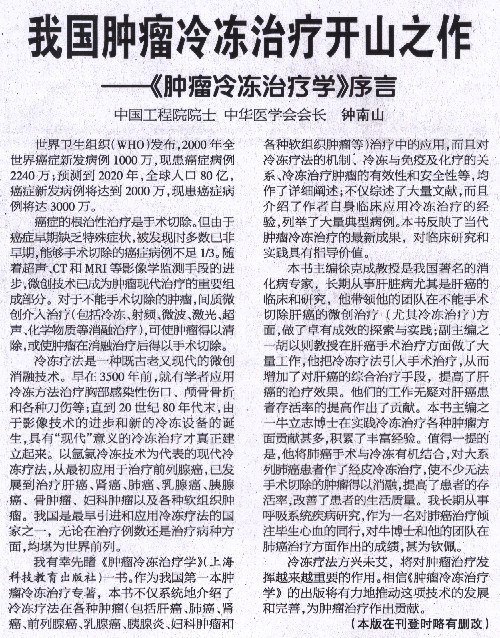 健康报:钟南山院士为《肿瘤冷冻治疗学》作序