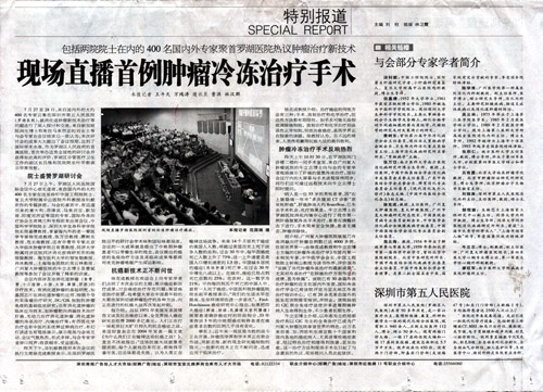 大会进行了经皮冷冻肝癌的操作表演。患者之一56岁进展型肝癌患者患右侧巨大肝癌。广州复大肿瘤医院牛立志博士担任主要操作者。再B超引导下,牛博士将“氩氦刀”冷冻针经皮穿刺靶向插入肿瘤内,然后冷冻,复温两个循环。术中病人安静、清醒。肿瘤很快形成冰珠。整个操作持续40分钟。全体代表对牛博士的精彩表演报以热烈掌声。