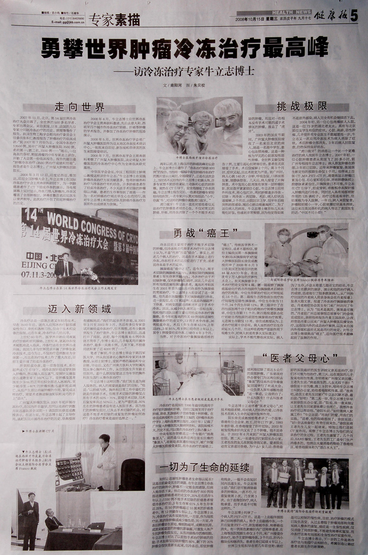 2008年10月15日,《健康报》第五版整版刊登了“勇攀世界肿瘤冷冻治疗最高峰-访冷冻治疗专家牛立志博士”一文,全面介绍了我院副院长牛立志博士在冷冻治疗癌症上的贡献,介绍了冷冻治疗的现状和未来的研究方向。