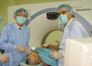 “虎口拔牙”的消息让一个比一个更难治疗的病人找到牛立志博士。2007年初,一位心脏肿瘤患者从美国飞了20多小时,到广州专程找牛立志博士。病人原发肿瘤在肺部,3年前已切除。近年来肿瘤复发,美国医生断定他的预期生命仅1个月。他带来上百张CT、MR、PET-CT片,清楚地显示肿瘤已累及心包、右心室和右心房,并将肺静脉和上腔静脉紧紧包住。开胸探查已不可能。牛立志在CT引导下,经皮穿刺,将数根冷冻探针插入肿瘤内进行冷冻,同时注入具有局部照射作用的125 碘粒子。治疗过程是艰辛的,但结果极为令人鼓舞。一年后,病人来院复查,肿瘤较前缩小一半,心脏填塞症状基本消除。这位来自美国洛杉矶的病人传达了美国医生的话:“中国不可小看!”