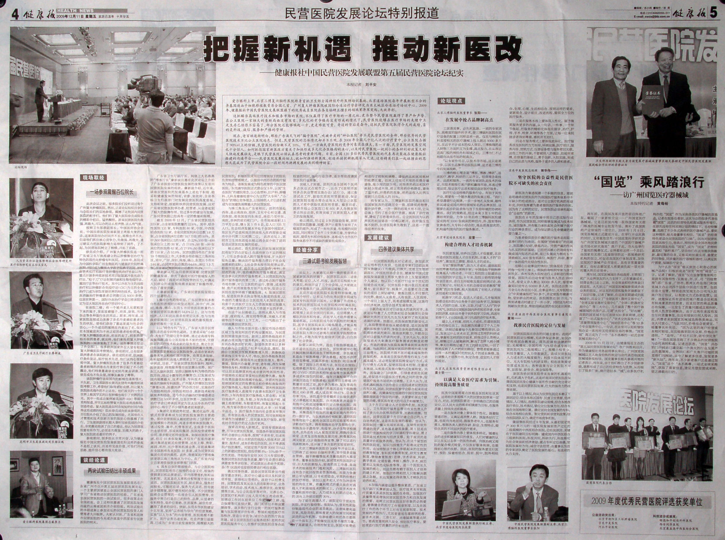 2009年12月11日,健康报在第5版以整版发表“把握新机遇,推动新医改”的特别报道,开篇标题是“一场参观震醒百位院长”,详细介绍第5届民营医院论坛期间,参观我院纪实,全文如下: