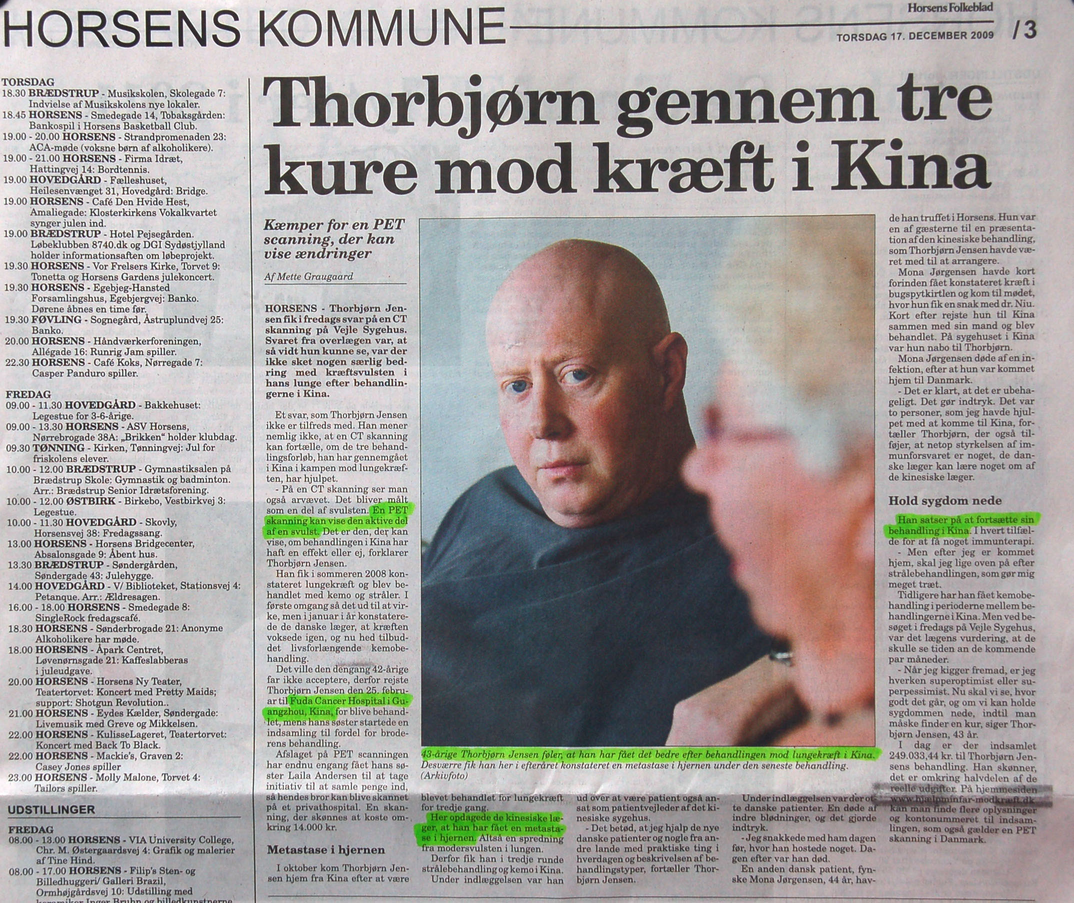 丹麦《Horsens Folkeblad》报纸,于2009年12月17日在“Horsens Kommune"专题采访了丹麦癌症患者杰森(Jensen)在我院治疗情况,杰森非常满意复大给他的治疗,并说复大医院有丹麦没有的PET检查和一系列综合搭配的肿瘤治疗方法。