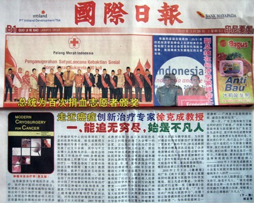 同一天,广东卫视和南方卫视也同时进行了报道。广州复大肿瘤医院和复大医院被评为广东省卫生先进单位,面对取得的成绩和荣誉,徐克成教授首先想到的是:大家向我们学习,我们怎么办?过去的一切不是我们今天骄傲自满的资本,我们没有停下来欢乐庆祝的时间,我们的第一要务还是尽一切努力,不断创新,服务好信任我们选择来我院治疗的癌症病人-------2010年3月徐克成教授主持引进留学日本多年的朴相浩博士在复大医院开展国际最新的肿瘤纳米介入治疗-------