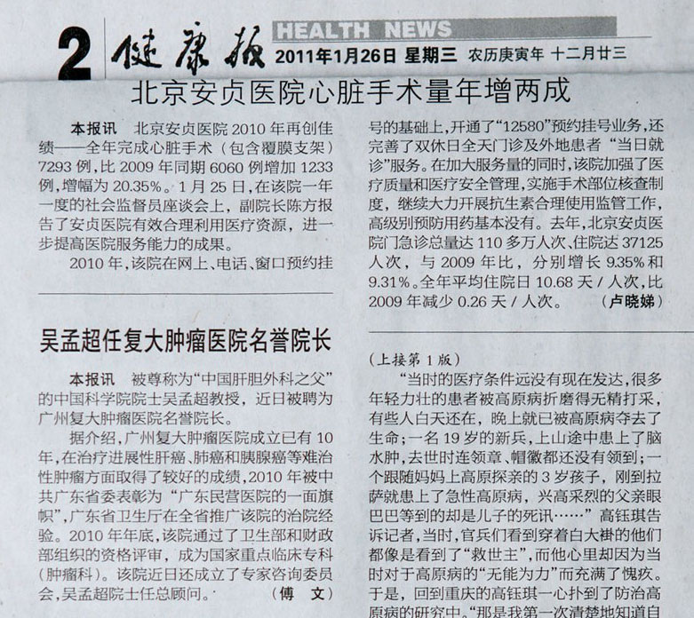 《健康报》:吴孟超任复大肿瘤医院名誉院长