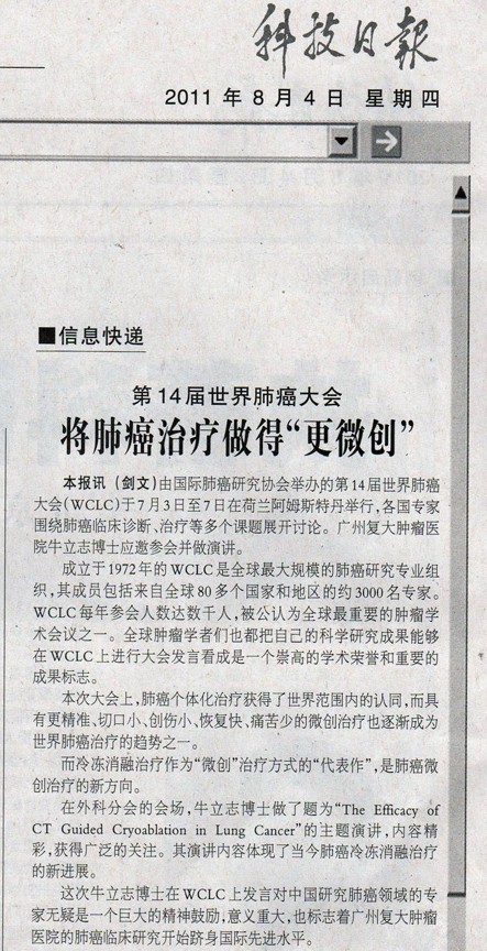 2011年8月4日,科技日报报道新闻——将肺癌治疗做得"更微创".