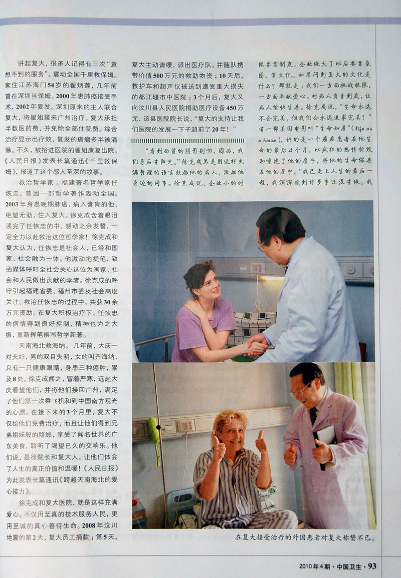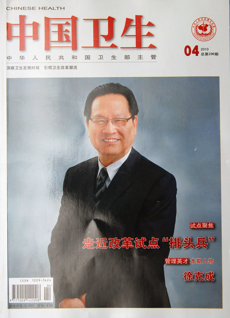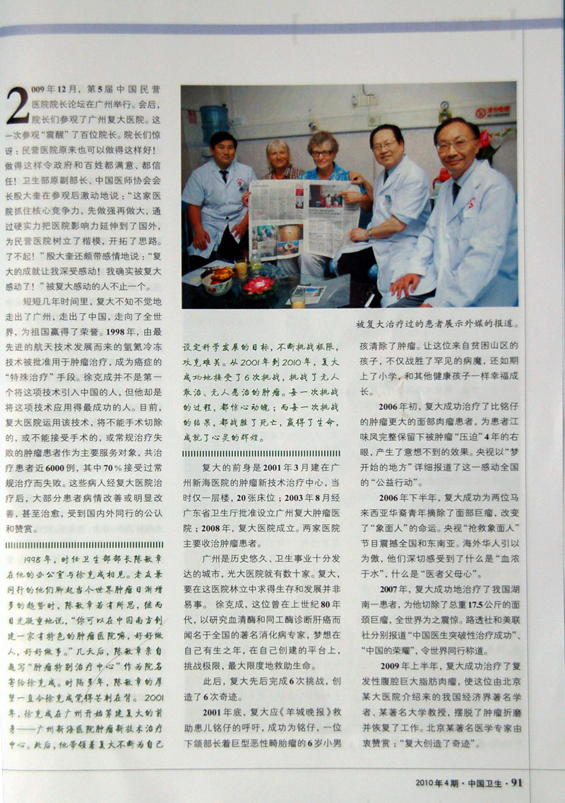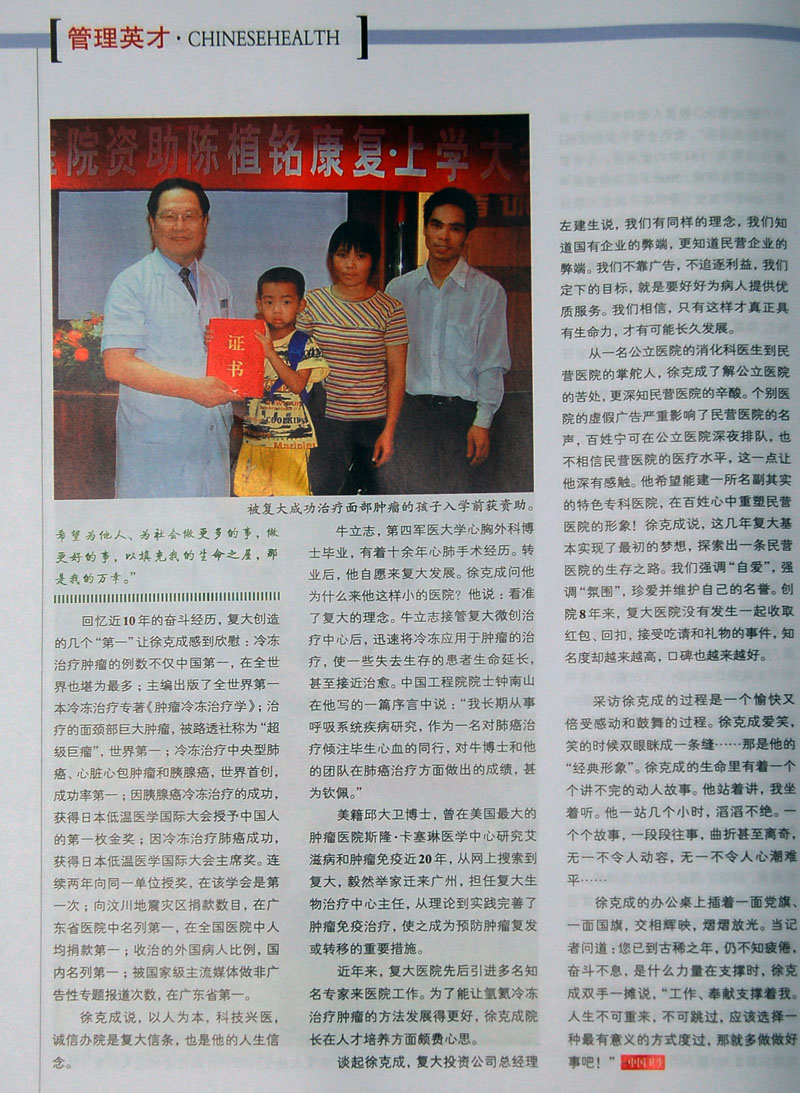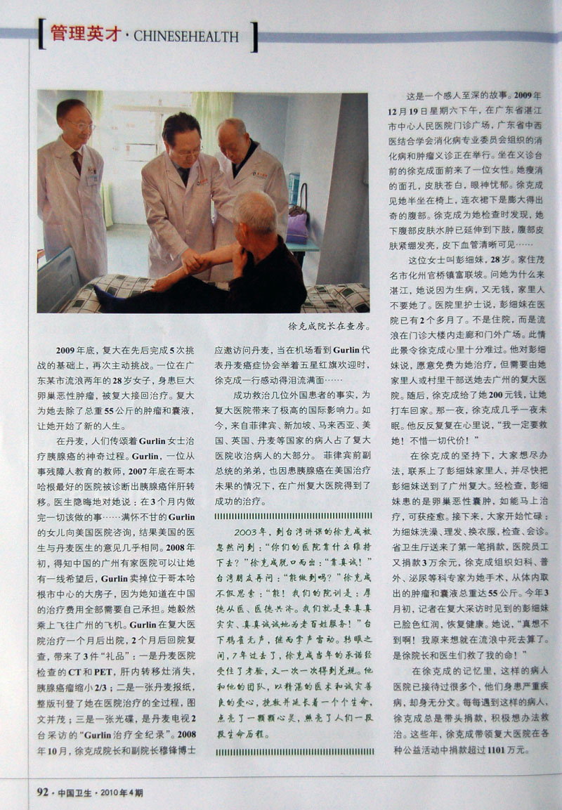 中国卫生杂志 2010.4 第296期 以广州复大肿瘤医院 总院长 徐克成教授做为封面人物,并在“管理英才栏目”以“徐克成:让生命旅程春光明媚”为题对徐克成院长做了专访,了解了徐克成教授20多年以来在祖国改革开放大环境中的孜孜不倦的人生追求,并详细记录了他领导的广州复大医院,冷冻治疗肿瘤的例数不仅在中国第一,在全世界也堪称为最多;他带领医院救治了一个个被判“生命无望”的病人,更向无钱就医的穷苦病人奉献爱心,重燃了他们的生命之火。他以真诚、至爱的“医者父母心”,救助了一个个生命,更奉献给社会一个春光明媚的世界。